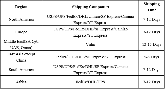 No matter where you are, we will deliver your order as quickly as possible. Therefore, we have established partnerships with different shipping companies. The basic information of different shipping companies is listed below: