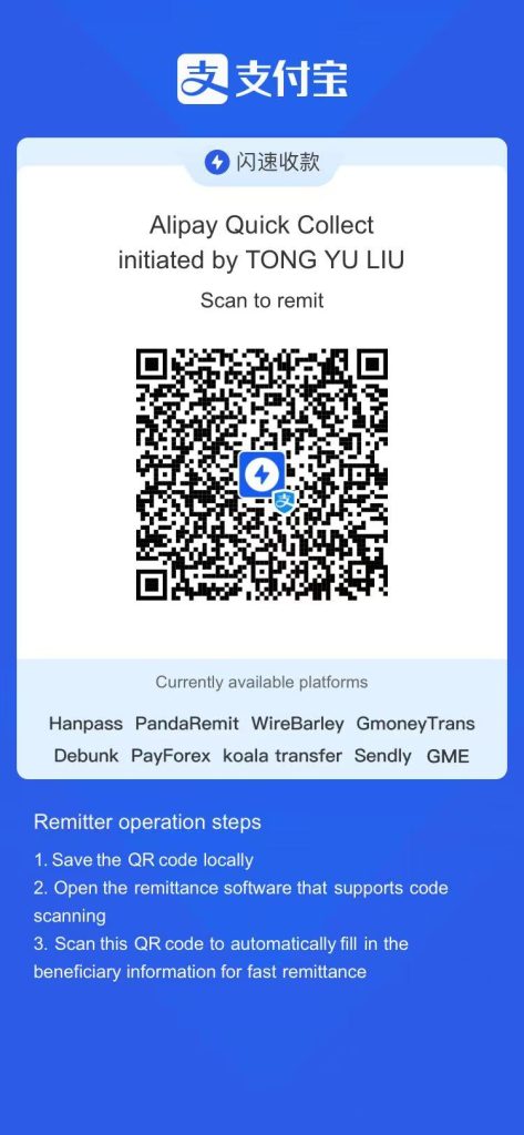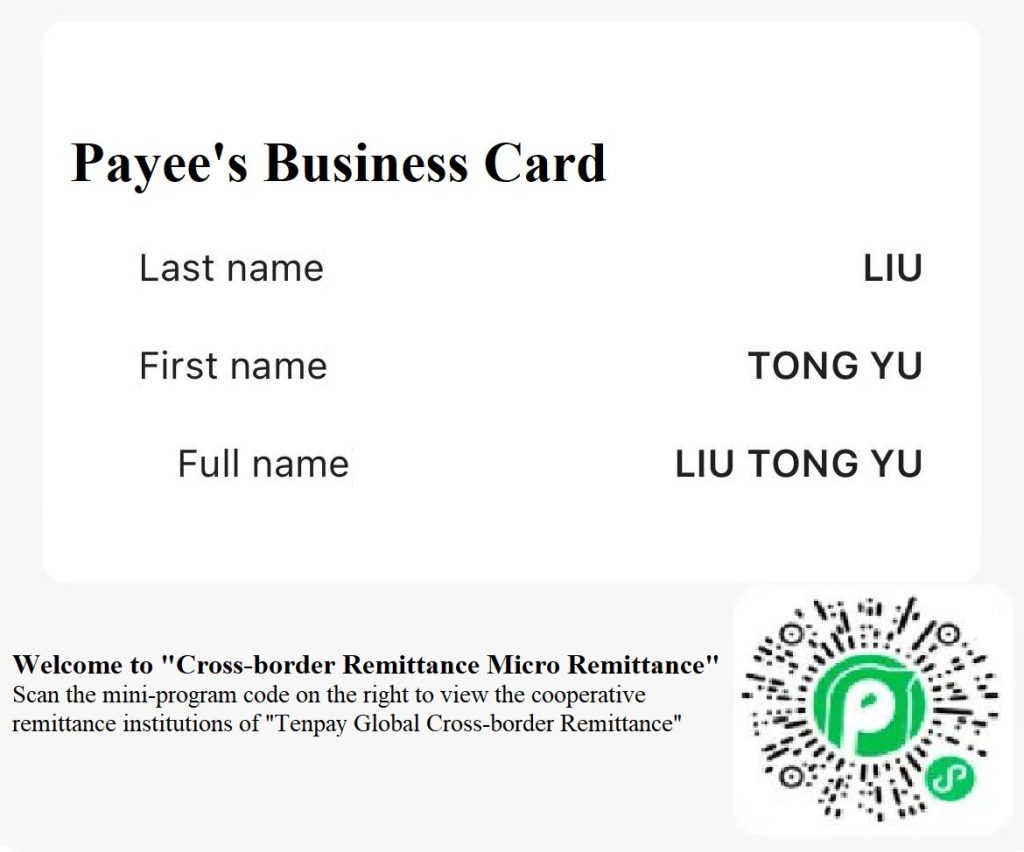 1、Account name:tongyu Liu,Bank name:JP Morgan Chase HONG KONG BRANCH,USD account:10151151816888;BIC/SWIFT:CHASHKHH