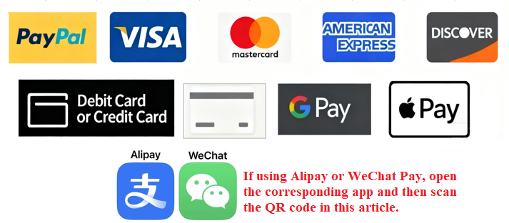 Payment options: After adding the product to the shopping cart, you can choose PayPal payment, Credit Card Or Debit Card, Bank Transfer, Google Pay, or Apple Pay. If you want to choose WeChat Pay or Alipay, please scan the QR code in this article. The above payment method cannot be used for successful payment. Please contact customer service.
