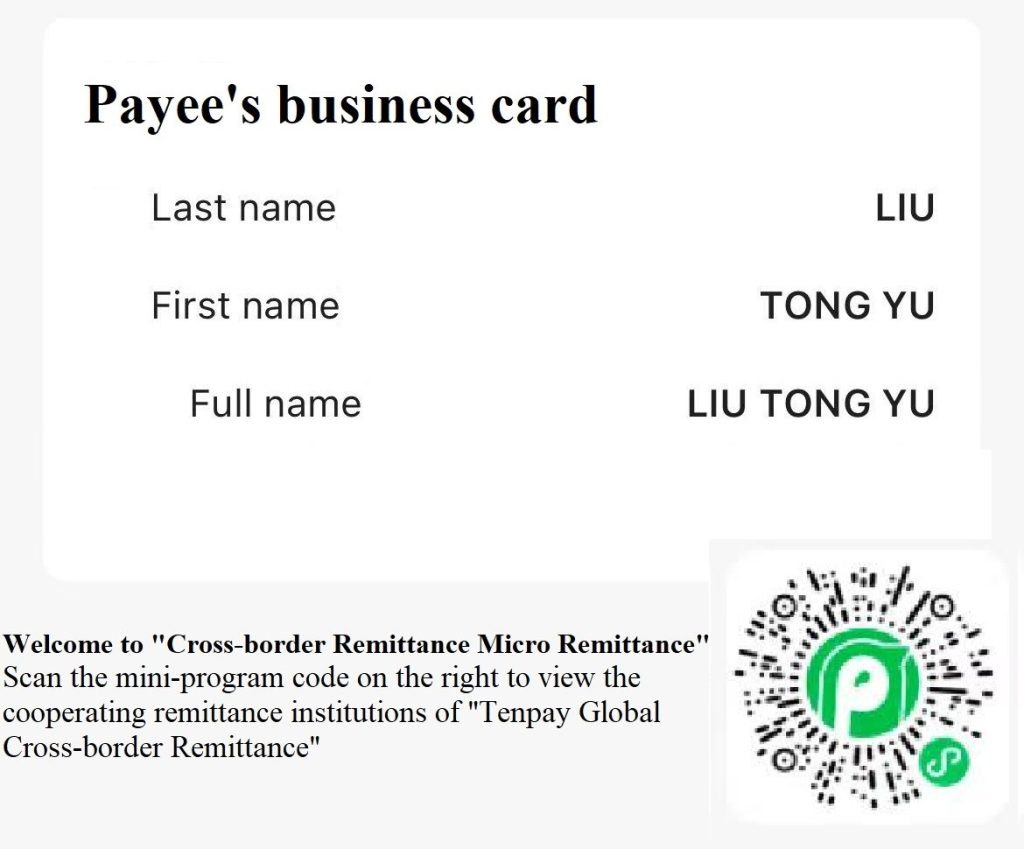 1、Account name:tongyu Liu,Bank name:JP Morgan Chase HONG KONG BRANCH,USD account:10151151816888;BIC/SWIFT:CHASHKHH