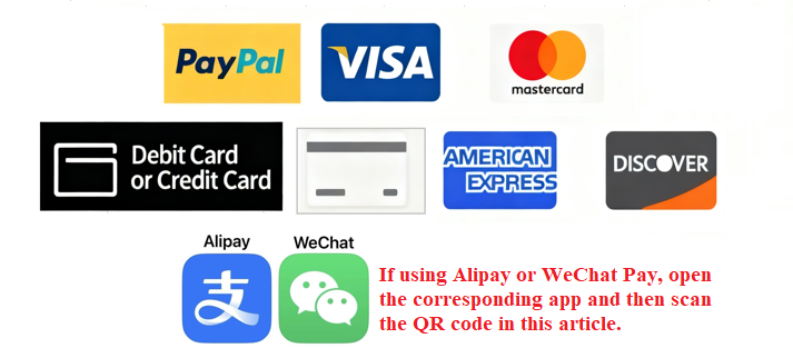 Payment Process: After adding the items to your shopping cart, proceed to checkout. The available payment methods include PayPal, credit or debit card, bank transfer, Payment by check.If you prefer to use WeChat Pay or Alipay, please open the corresponding app and scan the QR code provided in this document. If the above payment method fails, please contact customer service.